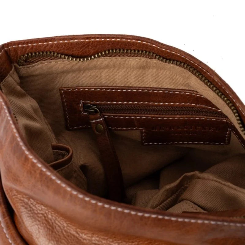 En håndlaget crossover-veske designet av 100 % ekte skinn, utsmykket med antikk messingbeslag. Den har glidelåslukking, ett stort hovedrom med innvendig glidelåslomme og to frontlommer i varierende størrelse for praktisk oppbevaring.